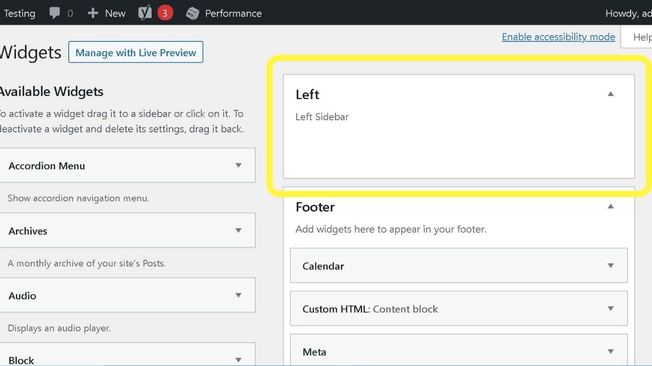 Si desea ver el progreso, puede volver a su sitio de WordPress, cargar el área de widgets y verá que la barra lateral izquierda se ha agregado como una nueva área de widgets.