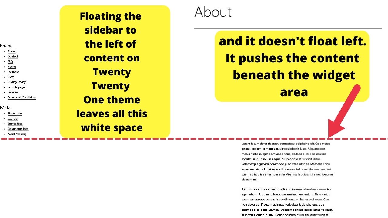 Para todos los demás temas excepto el tema de veintiuno veintiuno (probablemente otros temas que no tienen una barra lateral registrada), el código CSS para alinear la barra lateral a la izquierda del contenido es
