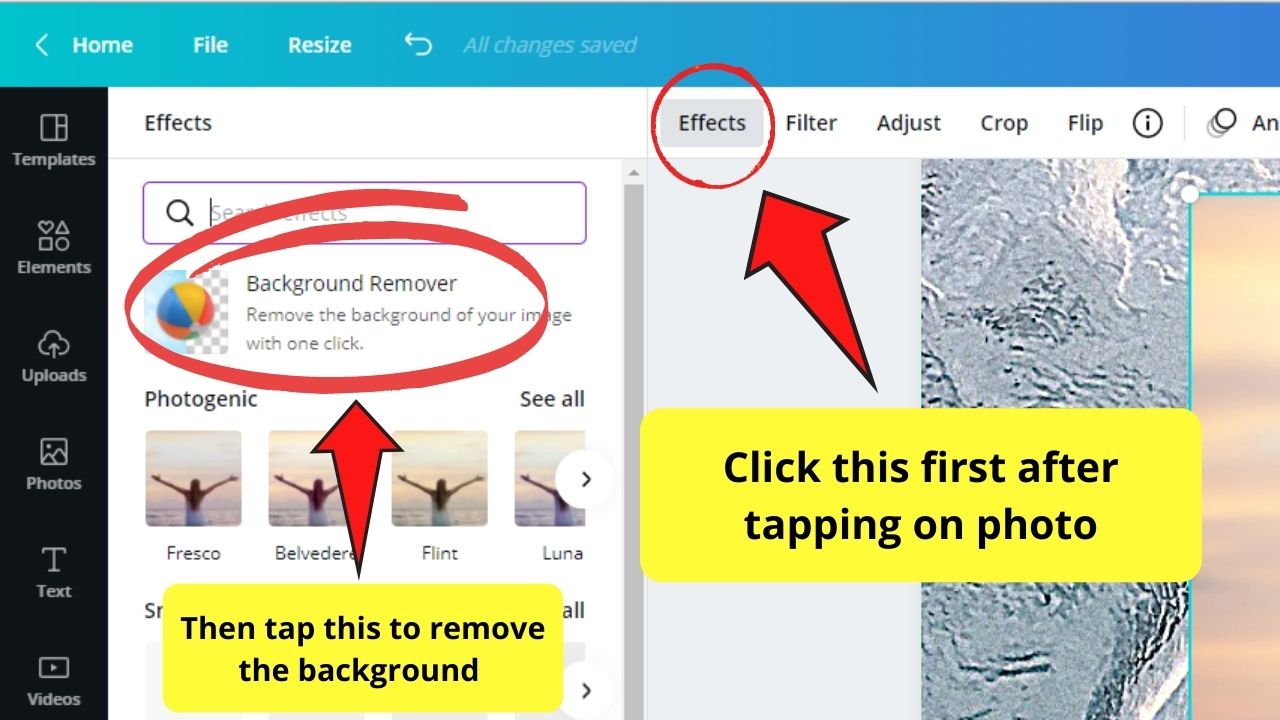 Para activar una función tan excelente, haga clic en dicha imagen hasta que aparezca una barra de herramientas blanca. Vaya a la pestaña Efectos y haga clic en Eliminar fondo en el menú lateral que aparece.