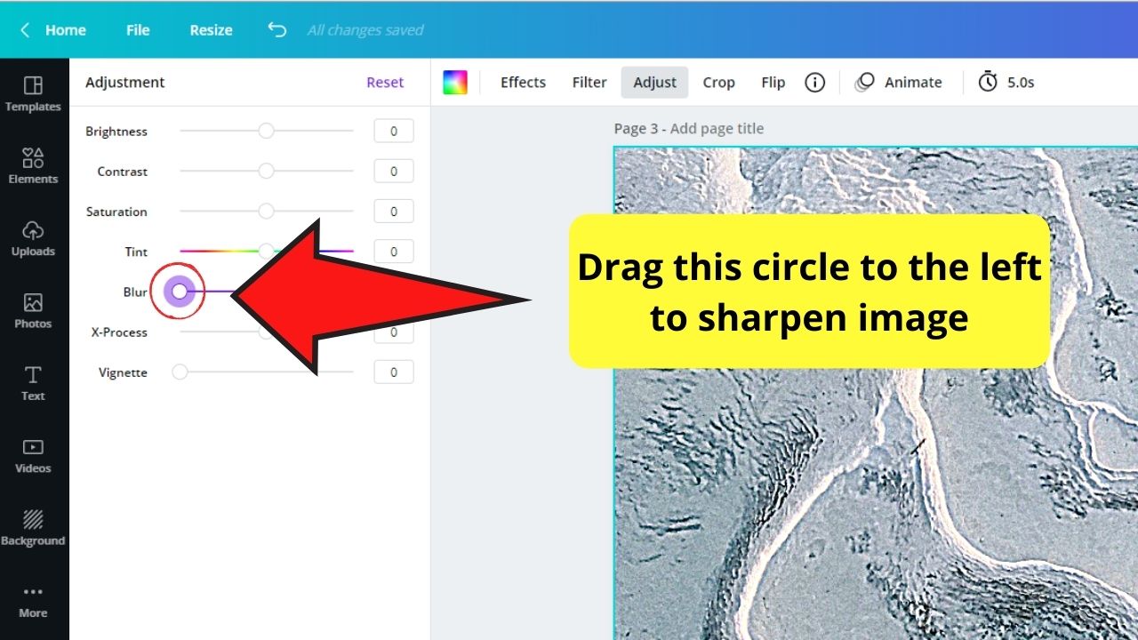 Paso 7: Haga clic y arrastre el punto blanco en el centro del control deslizante de desenfoque hacia la izquierda para enfocar la imagen.