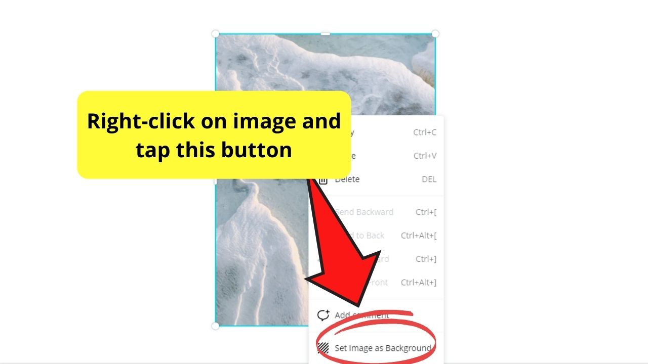 Etapa 4: Si desea que la imagen sea el fondo, haga clic con el botón derecho en ella hasta que aparezca un menú desplegable. Seleccione Establecer imagen como fondo para estirar la foto al tamaño del documento.